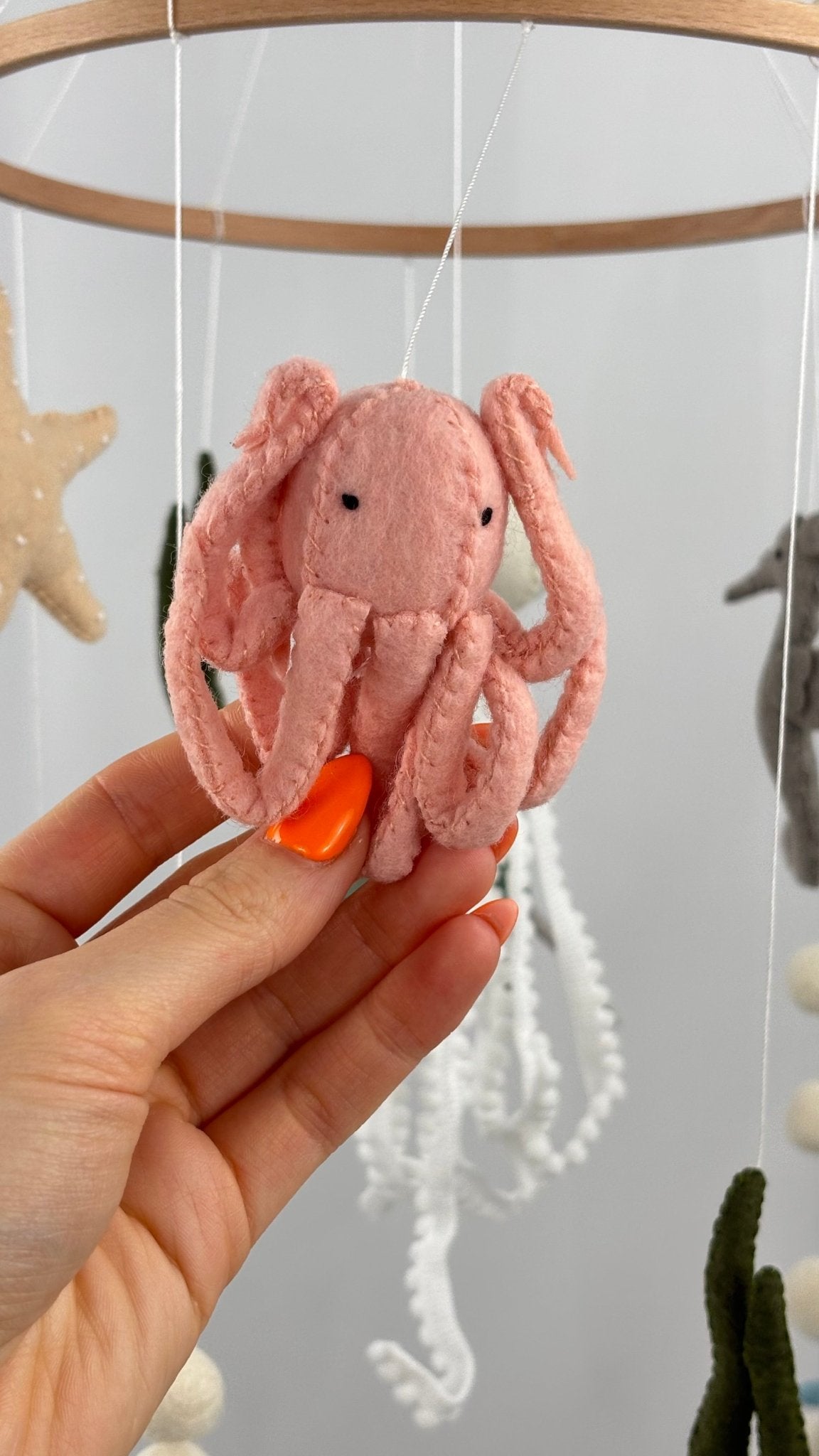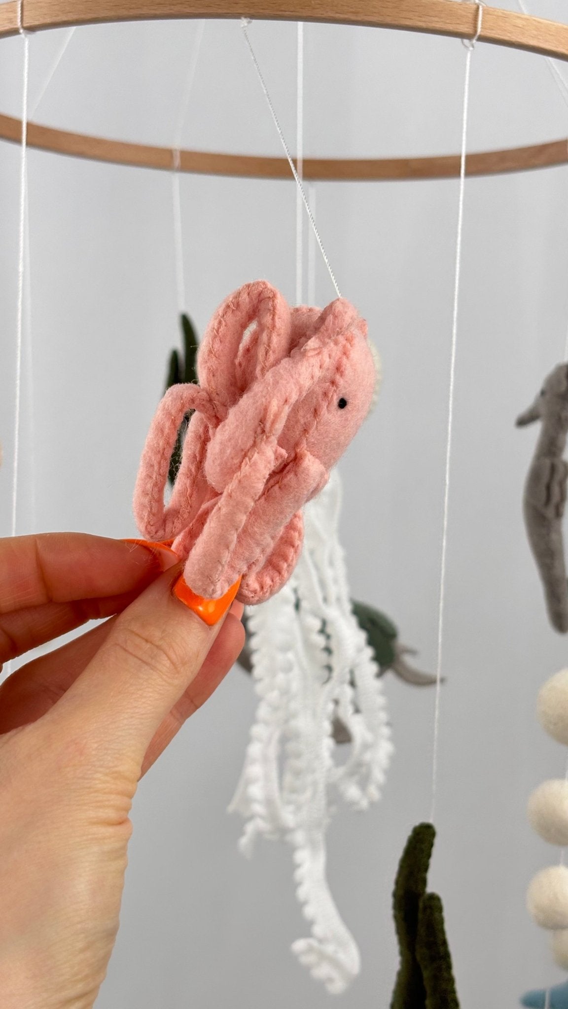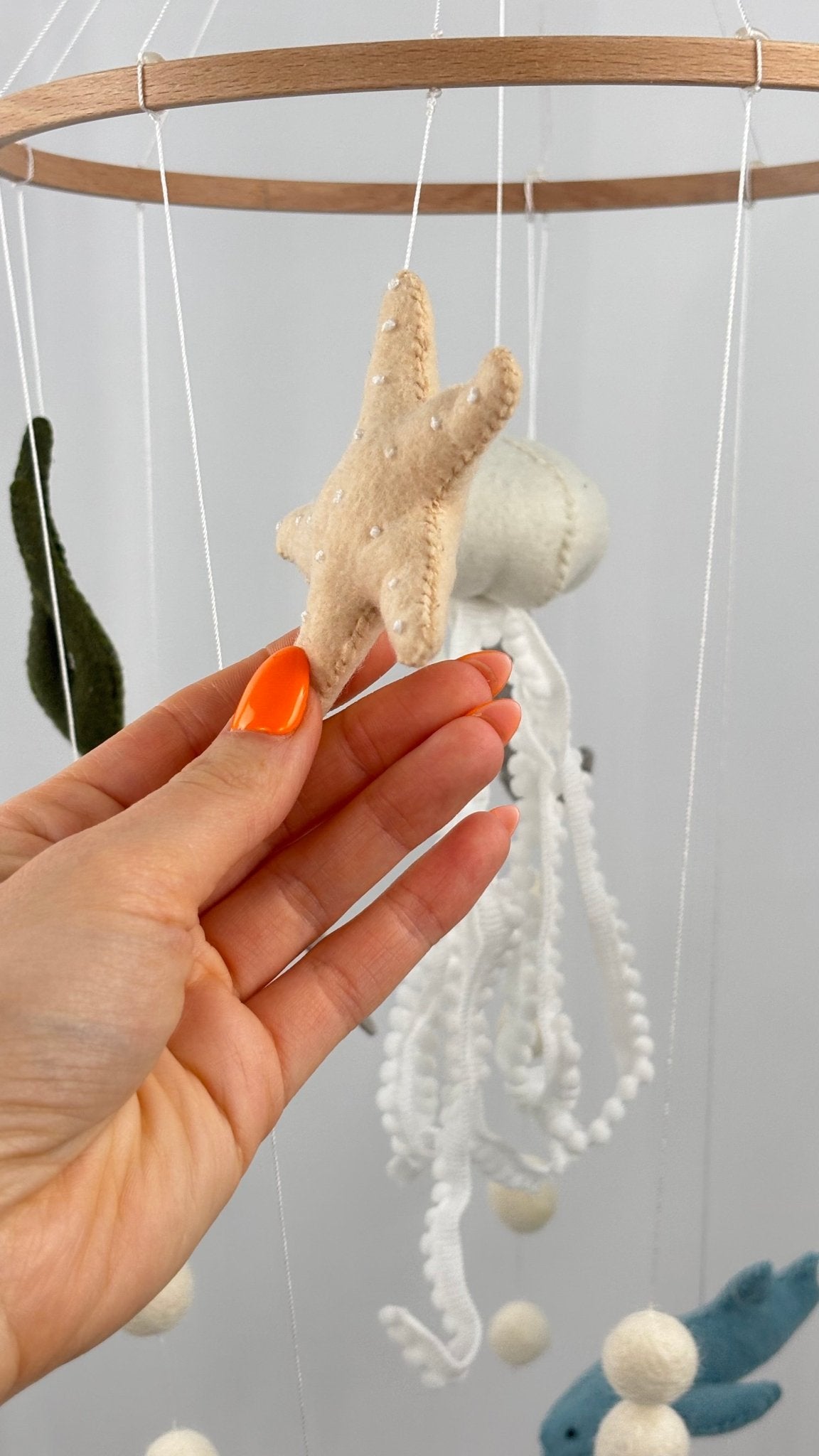Each element – from the gentle jellyfish to the tiny sea turtle – is carefully stitched and softly weighted to create a slow, soothing sway above the cot. Designed as nursery décor rather than a toy, it adds a natural, ocean-inspired accent that pairs perfectly with neutral interiors.