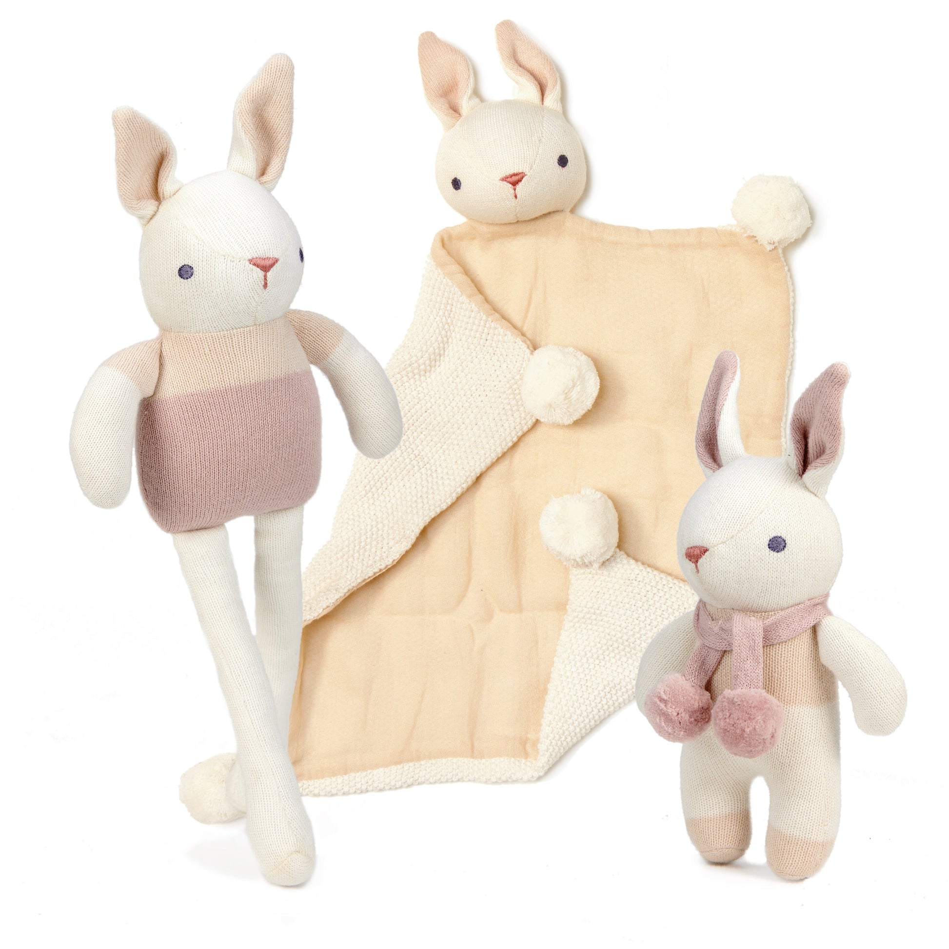 A bundle trio which includes a rabbit toy with rattle, a comforter, and a soft knitted bunny doll. All crafted from an organic cotton, soft fine knit and filled with 100% organic cotton. The comforter is complete with a muslin panel and pretty pom poms, and the little bunny toy has a gentle rattle inside to amuse babies with its sound.