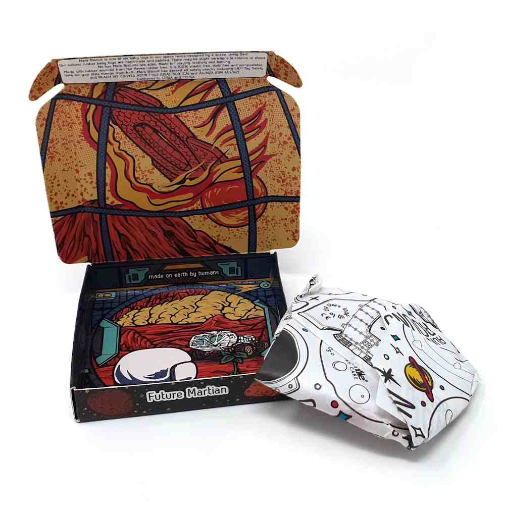 Mars Biscuit® - Shaped like a biscuit, looks like Mars! Look out for Olympus Mons, Curiosity, Spirit and Opportunity Rovers, Pathfinder, Mars HAB/Potato Farm, the Grand Canyon of Mars and many more features! Has the slogan 'Future Martian'.