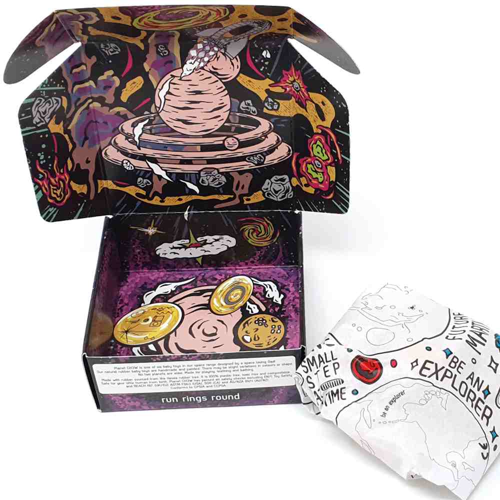 Planet CH3W® (blue or peach with grey rocks) - Our ringed planet has a textured surface with three rings which contain an assortment of moons and rocks, perfect for chewing on! Contains the slogan 'run rings round', as we're sure the baby owner will do to his or her parents!