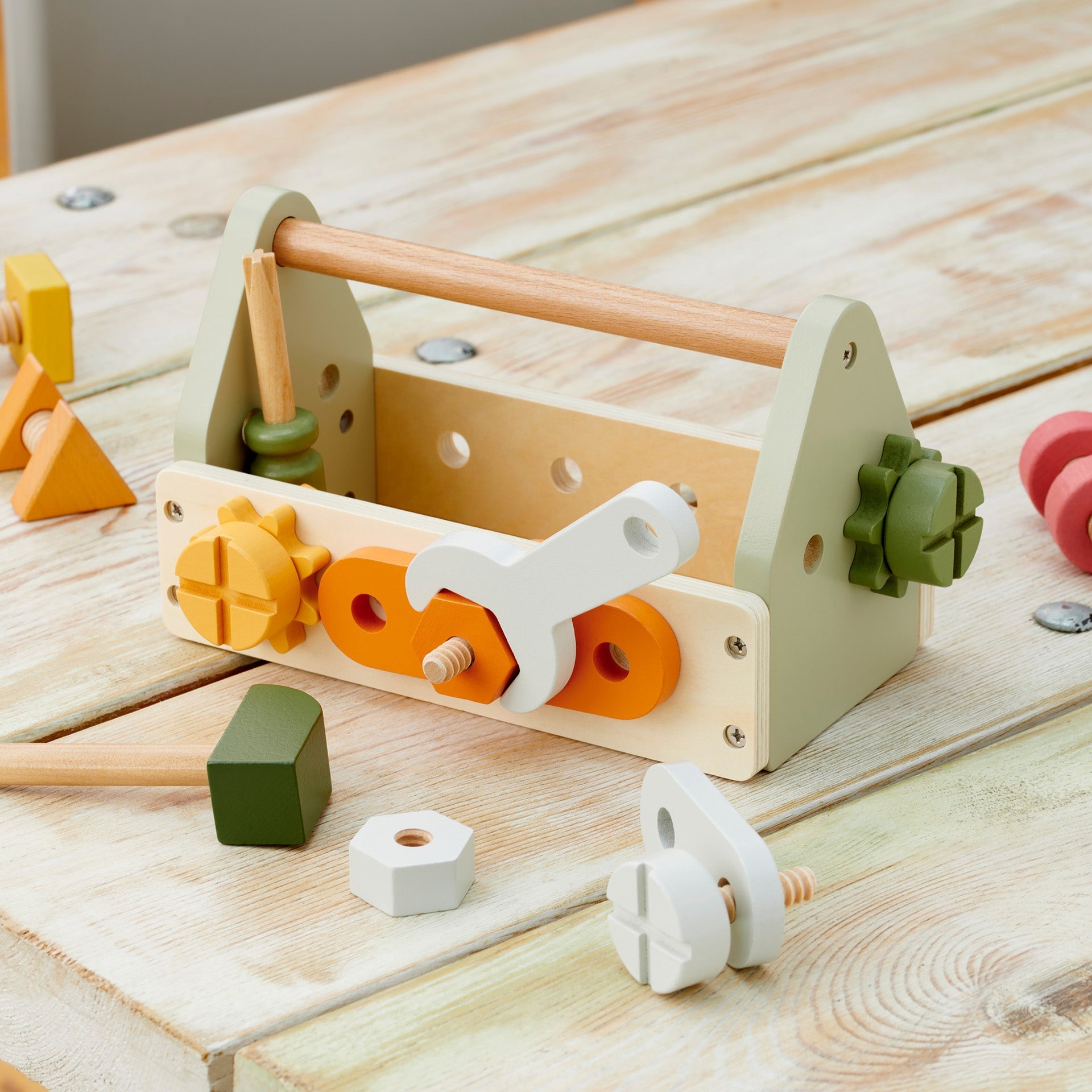 Encourage your child's creativity and motor skills with our wooden tool box playset. This handy set comes with a variety of colourful, child-sized wooden tools, including a hammer, wrench, screwdriver, and various nuts, bolts, and gears for pretend play construction projects.