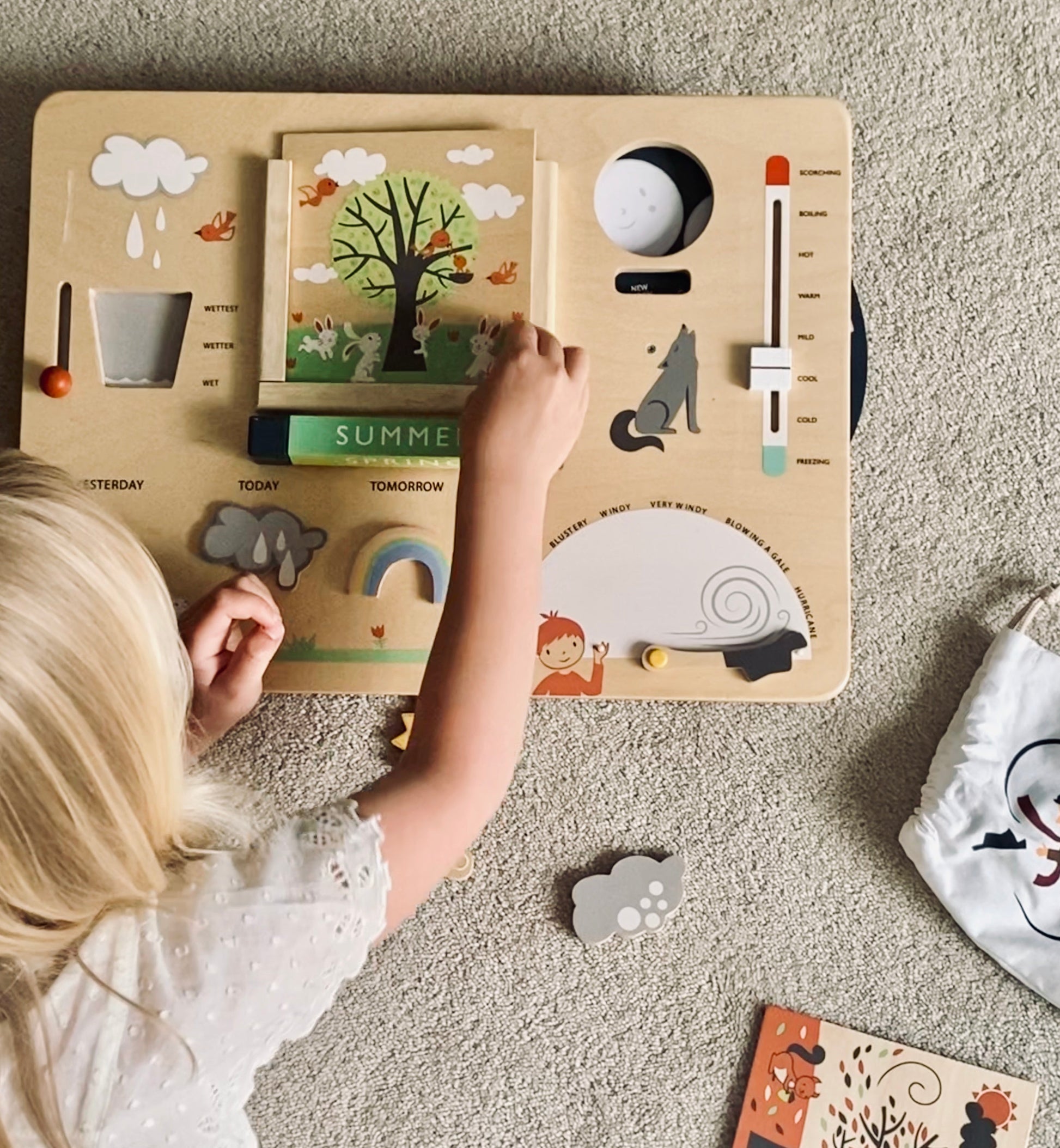 Kept safe in a printed drawstring bag are 9 weather symbols to magnetically place on yesterday, today and tomorrow forecasts.